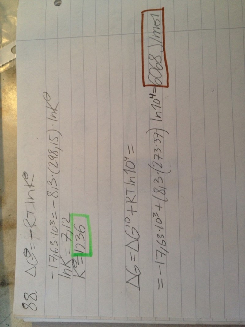 ANDRA FRÅGAN (mitt svar är nedan markerat i brunt): Calculate Gibbs free energy change i 37*C för denna reaktionen om koncentrationen av produkten vid den specifika stunden är 10^4 gånger högre än koncentrationen av realtanten.