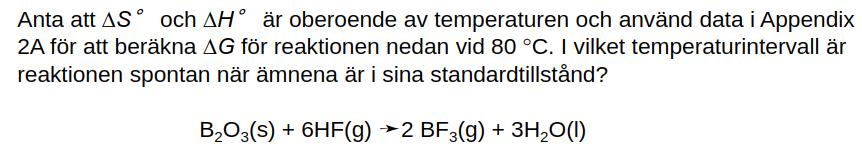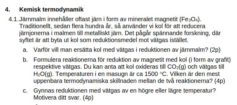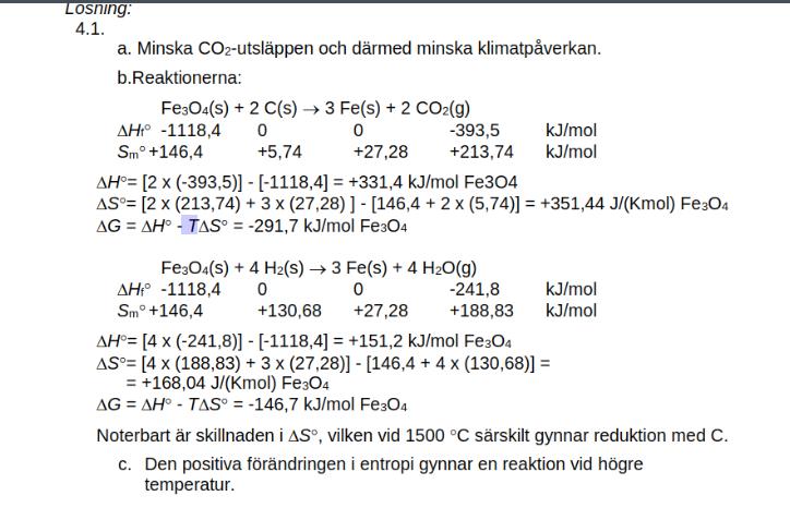 Man använder och ΔS°, trots att dessa värden är vid 25 grader och reaktionen sker i en masugn där T=1500 C vilket är givet. Är det "legitimt" att göra så eftersom man sedan infogar värdena i uttrycket för Gibbs fria energi, eller saknar uppgiften information om att man kan anta att man kan använda standardentropier och standardentalpier?