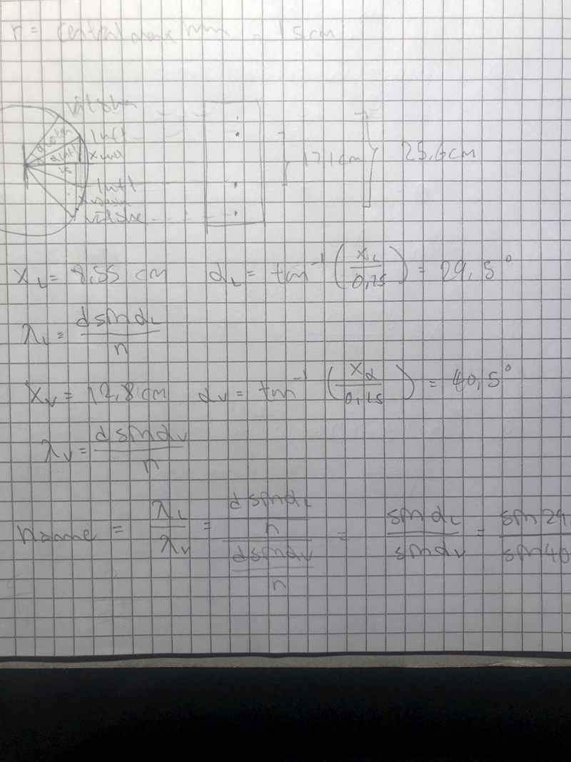Mitt i en cylindrisk glasskål med tunna väggar monteras ett gitter med spalterna vertikala. En smal ljusstråle från en laser riktas vinkelrätt mot gittret. Ett tunt genomskinligt papper fästs på skålens utsida. På pappret markeras de punkter som visar andra ordningens ljusmaximum. Skålen fylls därefter med en vätska vars brytningsindex ska bestämmas. På nytt markeras andra ordningens ljusmaximum. Sedan pappret tagits loss och lagts på ett bord har det följande utseende: