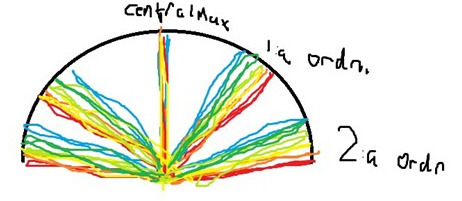 Börja med att rita upp det så som man vill att det skall vara: centralmax syns förstås, hela första ordningens spektrum skall synas, hela andra rdningens spektrum skall synas och tredje ordningens spektrum skall inte synas. Ungefär så här, men gärna snyggare: