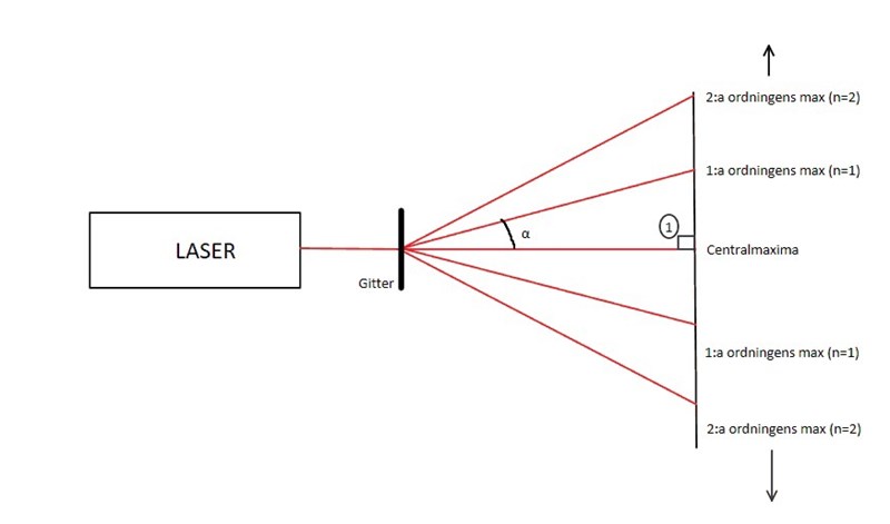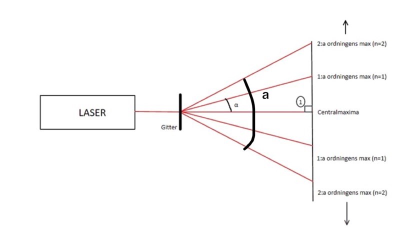 När du vet att det handlar om gitter kan du direkt rita upp något liknande. Det viktiga med vinkeln här är att den är mellan 2a ordningens max. Kan du rita en egen bild och visa var den vinkeln sitter?