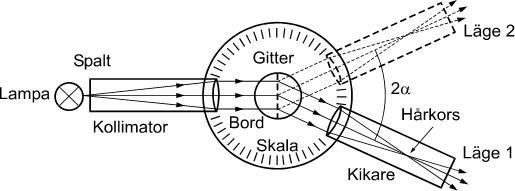 Ett precisionsgitter stämplat 570,0 linjer/mm användes. I gitterspektrometer avläsnings kikare kunde man se samma gröna spektrallinje med våglängden 546,07 nm av en viss ordning i två lägen. Till vänster om centrallinjen i läge 1 avlästes gradtalet 110,70 och till höger i läge 2 gradtalet 187,70 (se figur).