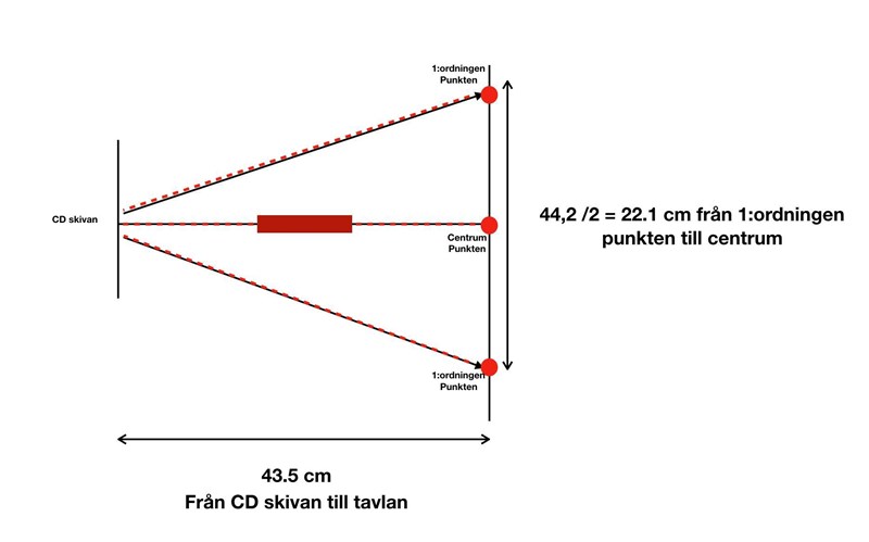 Hej alla! Håller just nu på med en laboration om gitter och interferens och ljus där en laser får träffa en CD skiva och på så sätt skapades det 3 prickar på en skärm bakom. De tre prickarna är maxima punkterna där våglängderna möts om jag har förstått de rätt. Uppgiften går alla fall ut på att beräkna fram värdet d, alltså avstånden mellan spåren i CD skivan. Man har även fått en mätnogranhet på 0.2+/- cm och