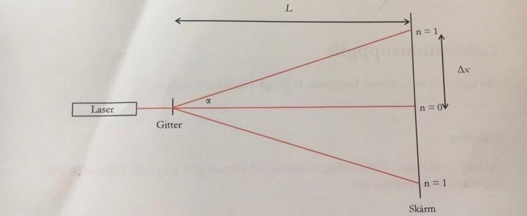 En annan fråga, våglängden för 100 linjer/mm ska väl vara samma för alla ordningar? Jag fick att det fanns 4 ordningar åt vänster och höger, de alla ska ha samma våglängd väl?