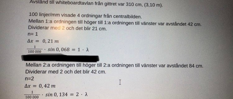 Avstånden 84cm, 42cm och 310cm skulle ju kunna vara någon millimeter fel, och då kan beräknad våglängd bli någon nanometer fel.