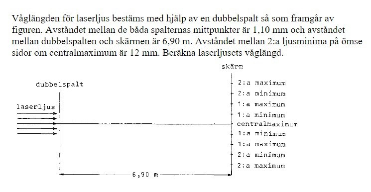 Min tanke var att först räkna ut vinkeln a som sedan ska användas i gitterformeln med där x är avståndet mellan 2:a ljusminima och centralmax och l är längden från dubbelspalten och skärmen. Då ljuset ligger på 2:a minima kommer ju gitterkonstanten se ut: .