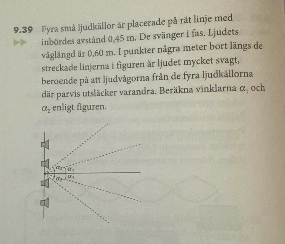 Hej! Hittade en uppgift där man skulle använda gitter formeln för att räkna ut nodlinjer, vilket verkar skilja sig lite grann från att hitta maxlinjer då n alltid ska vara ett heltal. N verkar kunna inta väldigt många olika siffror för att en nodlinje ska finnas, ex om 4 källor av ljud finns så behöver avståndet mellan varje källa endast vara 0,25, men 0,5 osv fungerar också. Finns det någon formel för att räkna ut vad n kan vara för nodlinjer?