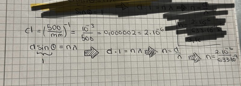 Laserljus med våglängden 633 nm träffar ett gitter med 500 spalter per mm. Vilken är den högsta ordningens ljusmaximum som kan förekomma?