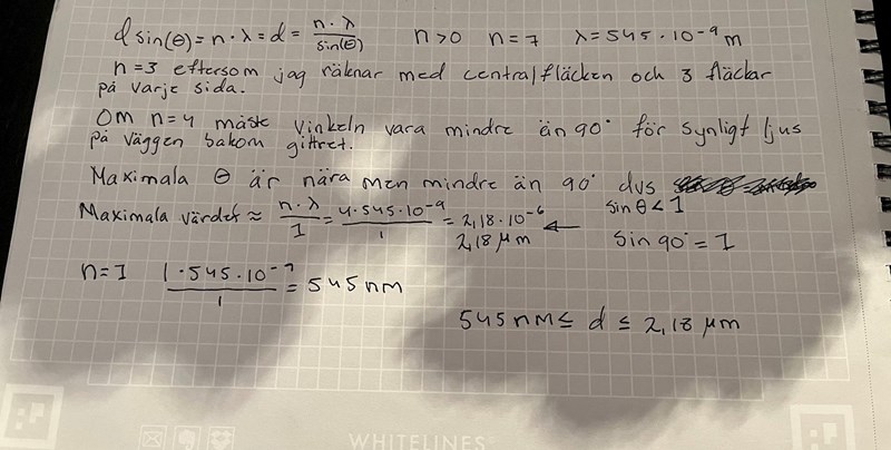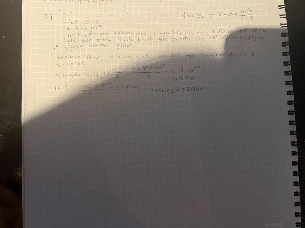 Hej! Jag undrar om jag har gjort rätt eftersom jag inte har facit. Frågan lyder ”En elev lyser med en laser vinkelrätt mot ett gitter. Laser|jusets väglängd är