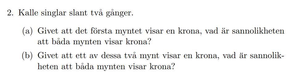 Givet att ett av de två kasten visar krona, vad är sannolikheten att båda visar krona?