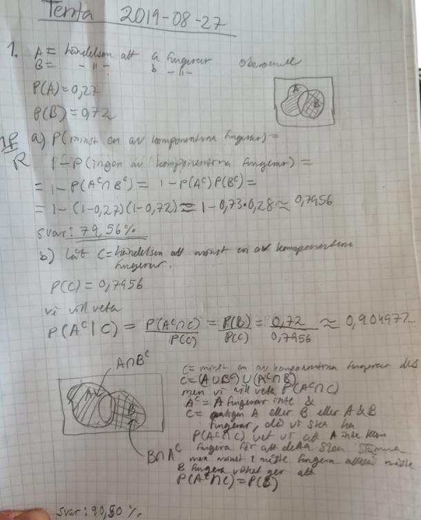 Calle_K skrev:Din likhet du ställer upp stämmer tyvärr inte. T.ex kommer händelse B även inkludera fallet då A fungerar, eftersom att A och B är oberoende. Likheten du skriver säger att B bara får fungera om A inte fungerar.