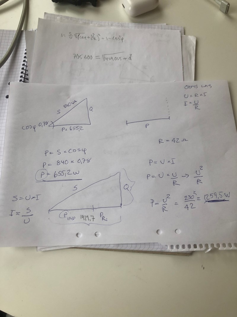 Skenbar effekt: s=U*I = 840VA= 230V*I (då det blir 3,652A)