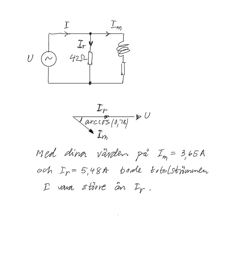 "En induktiv last och resistiv last är parallellkopplade och är enfasigt anslutna till 230V 50Hz.
