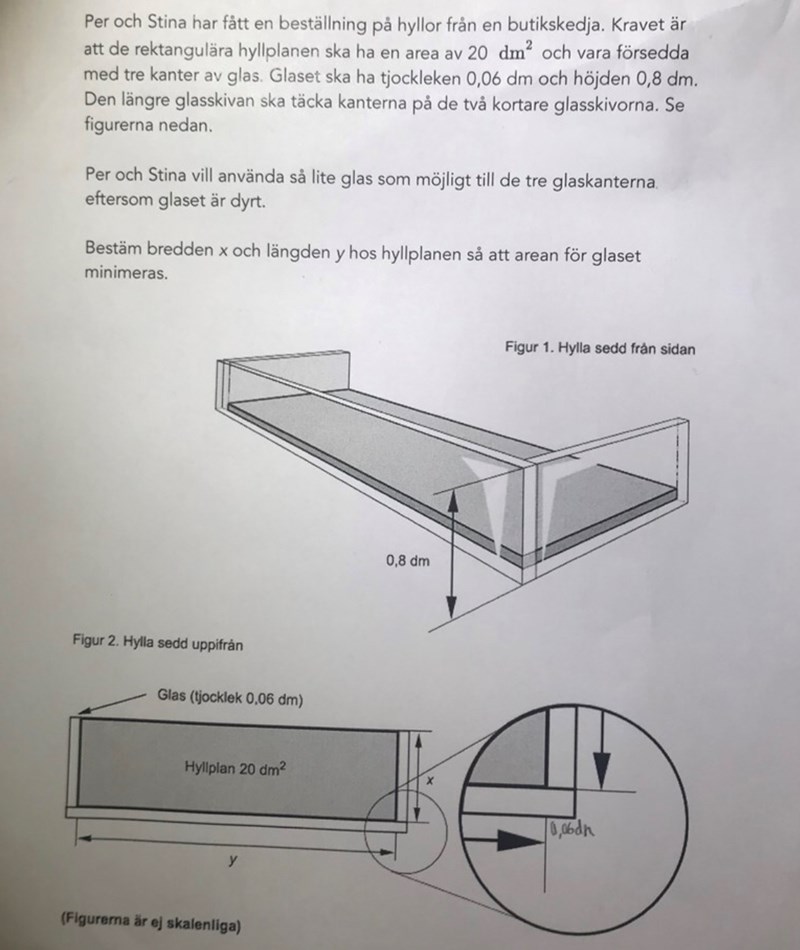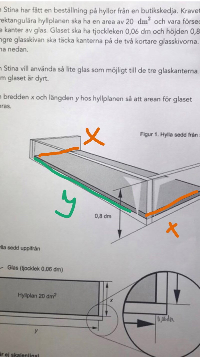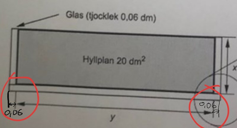 Alltså ska den glasskivans längd vara 0,06 + y + 0,06 dm = y + 0,12 dm