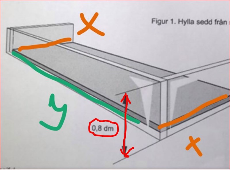 Därför ska glasskivan ha samma längd som hyllplanets djup, dvs x dm.