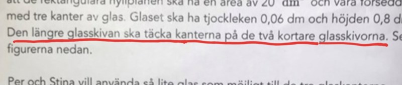 Glasskivorna som sitter längs med de korta kanterna ska inte sticka ut åt något håll. Därför måste de vara exakt x dm långa.