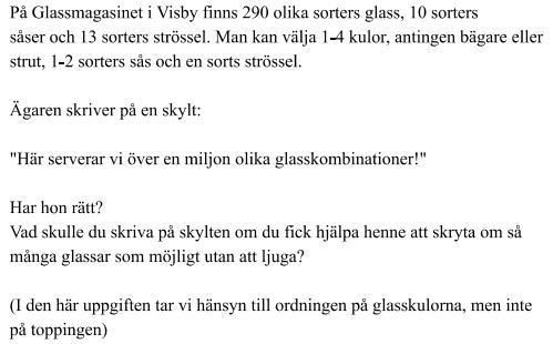 så som jag förstår det nu så har vi räknat ut glasskombinationerna och sås kombinationerna: