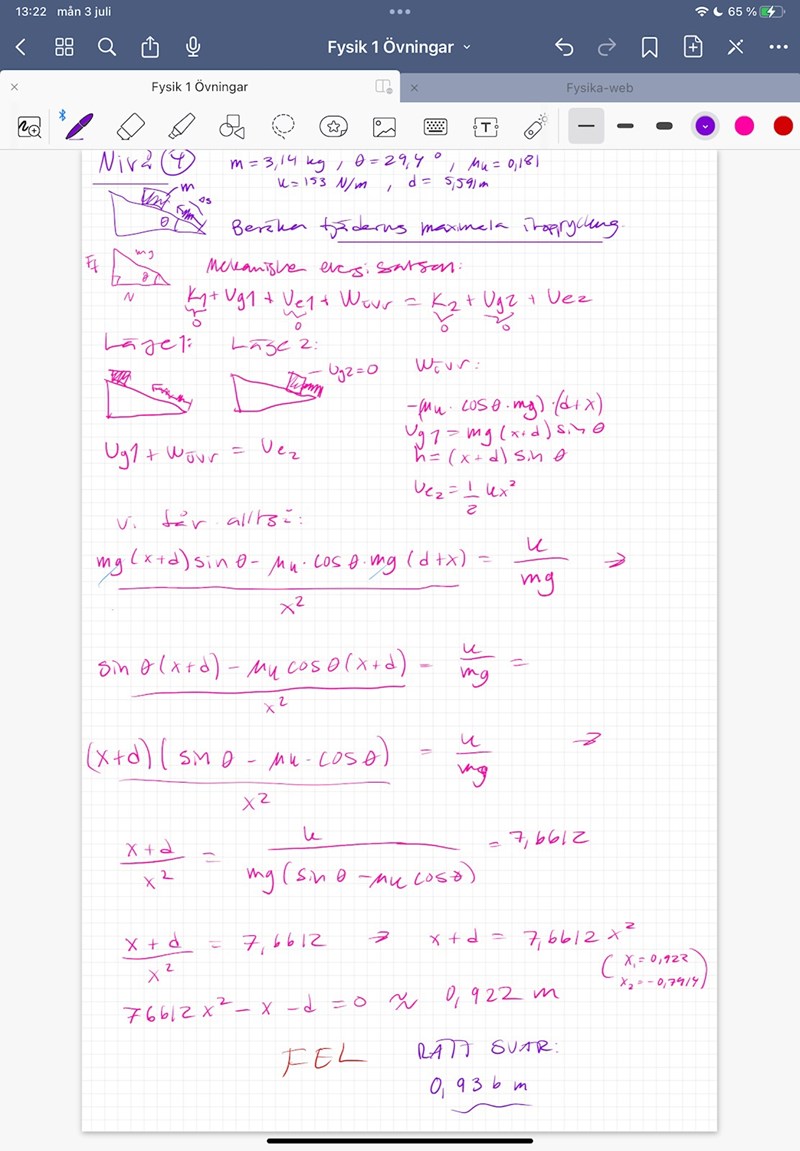 Jag har denna uppgift: Låda med massa 5,54 kg glider ned från ramp med vinkeln 28,7 grader, samt kinetisk friktionskoefficient 0,226. Startar från vila. Om lådan träffar en fjäder med fjäderkonstant 169,8 N/m när den glidit sträckan 1,601m, beräkna fjäderns maximala ihoptryckning.