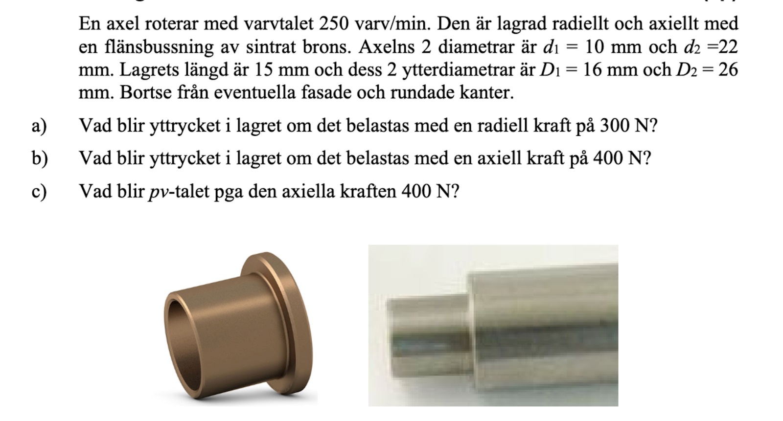 CurtJ skrev:Lagrets ytterdiametrar är annorlunda i det andra exemplet. Arean som påverkas av den axiella kraften är den ringformade arena i änden av lagret som formas av lagrets största ytterdia (18 mm) och hålets dia (10 mm) vilket ger dig rätt svar.