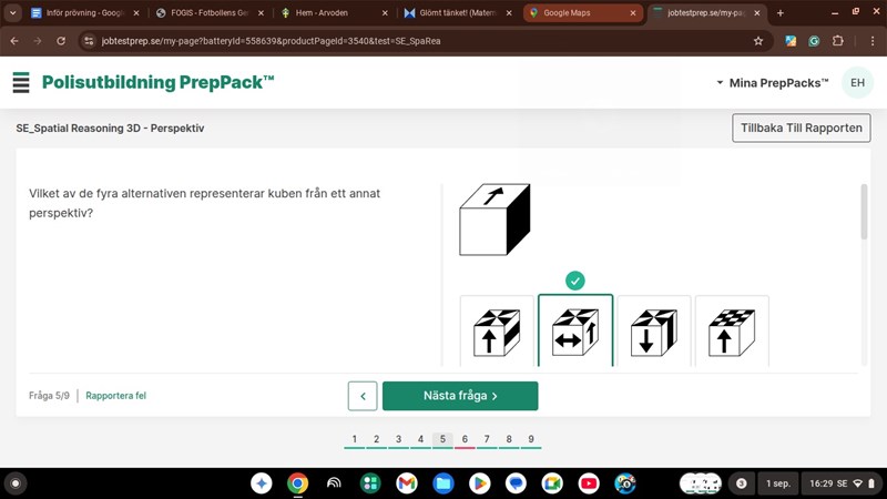 Förstår inte, om man tänker att pilen ska peka ner som i alternativ tre, då hamnar ju svarta sidan på vänster sida om kuben (i kuben längst upp på bilden). Sedan vrider man ner den så att pilen pekar neråt (som i exempel 3). Då blir ju toppen, och höger sidan "okönda" - därav kan ju också alternativ 3 vara rätt?