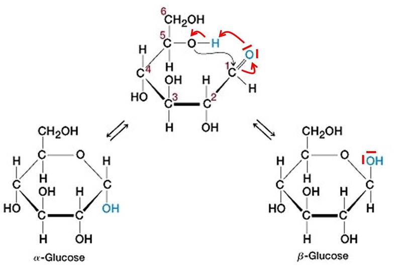 Okej, och de 2 fria elektronerna som var bindningen mellan O och H hos kol 5 blir då bindningen mellan O och kol 1 istället? Eller är det så den andra röda pilen (vänster) menar?