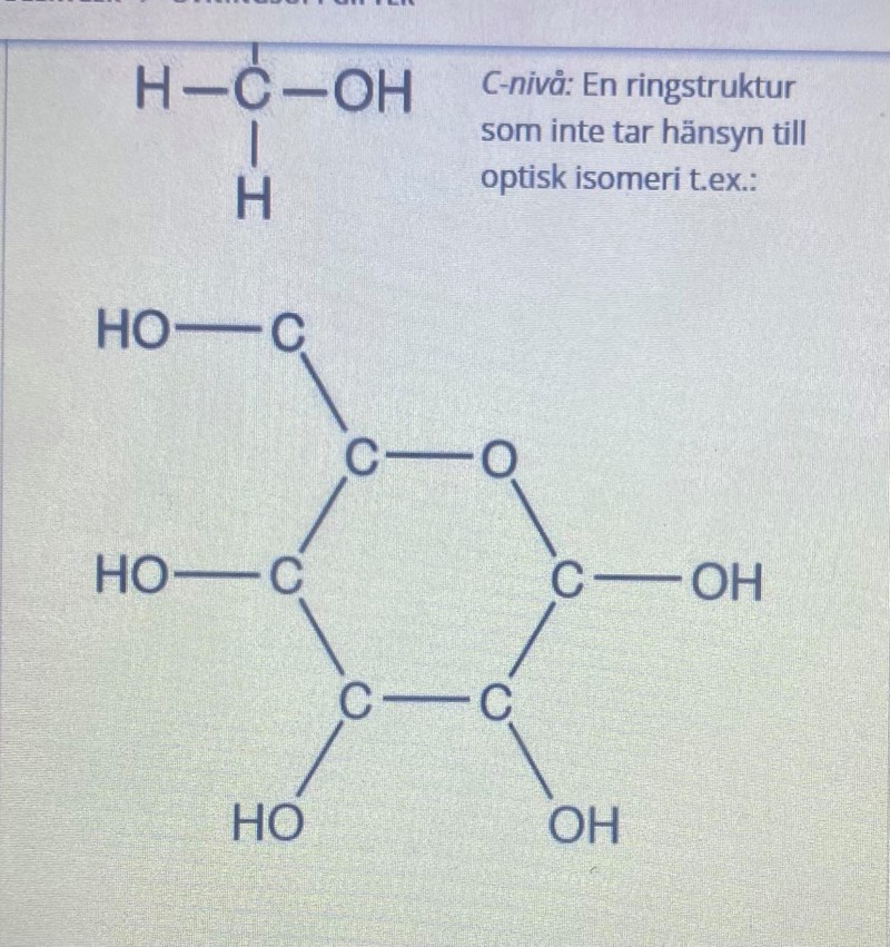 optisk isomeri uppstår väl när linjära glukosmolekyler ska bilda en cyklisk molekyl. I boken står det följande "en linjär glukosmolekyl böjs så att hydroxylgruppen på kolatom nummer fem närmar sig aldehydgruppen. När detta sker kan hydroxylgruppens syreatom utnyttja ett av sina fria elektronpar för att bindas till aldehydgruppens kolatom. Samtidigt släpper hydroxylgruppen sin väteatom som får flytta till aldehydgruppens syreatom. Efter denna reaktion har det bildats en cyklisk molekyl i vilken fem kolatomer och en syreatom bildar hörnen i en sexhörning. Det bildas två olika ringformade optiska isomerer då en glukosmolekyl sluts. Det beror på att väteatomen och hydroxylgruppen på kolatom nummer 1 kan råka hamna i olika riktningar. De båda cykliska glukosisomererna kallas α-glukos (alfa-glukos) respektive β-glukos (beta-glukos)." men förstår inte riktigt vad som menas