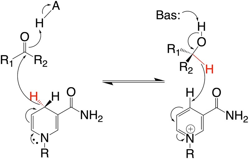 Nästan så, det är en hydridjon H- (d.v.s. en proton med två elektroner) som överförs till NAD+, och resultatet blir NADH (d.v.s. den reducerade formen av vätebäraren).