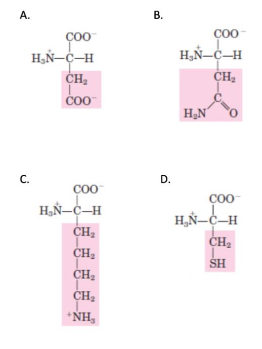 Du känner till primärstrukturen för ett protein som du vet innehåller många glykosyleringar. För att fastställa vilka aminosyrarester som potentiellt skulle kunna glykosyleras analyserar du i ett första steg vilka R-grupper som är vanliga i proteinet.Vilken av följande R-grupper bör du fokusera dina fortsatta studier på? Se bifogad bild.
