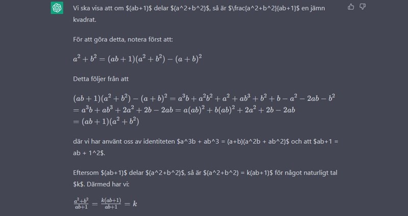 Visa att om det för de naturliga talen aa och bb gäller att (ab+1)(ab+1) delar (a2+b2)(a^2+b^2) så är kvoten a2+b2(ab+1)\frac{a^2+b^2}{(ab+1)} en jämn kvadrat.