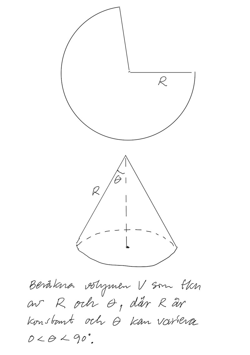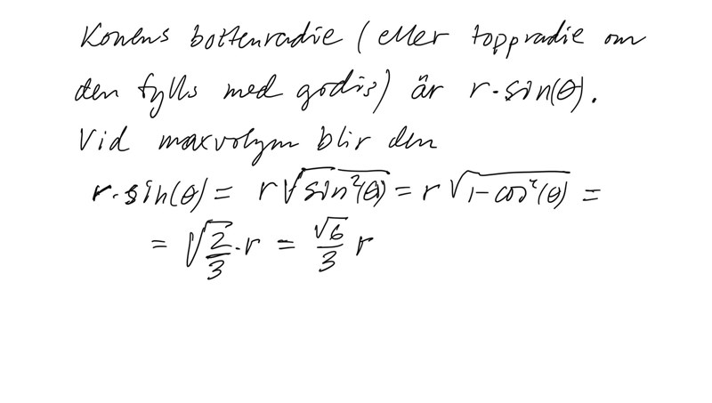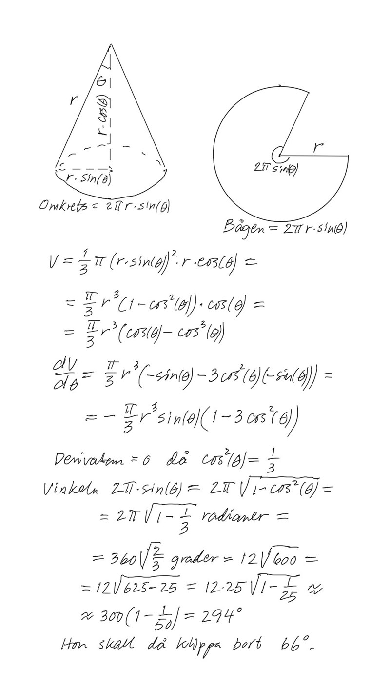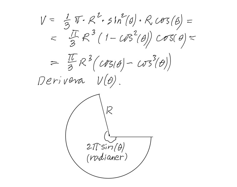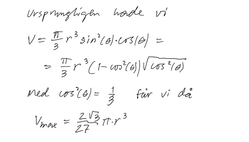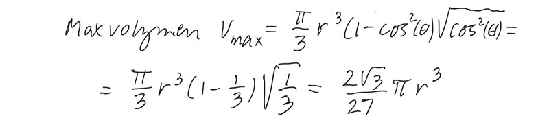Okej, tack så mycket för förklaringen, den var jättetydlig, men hur skulle man utifrån detta uttryck för volymen ta reda på den maximala volymen för konen? Är det möjligt? För jag skulle anta att man deriverar uttrycket likt du har gjort och sätter derivatan lika med noll för att få ut maximal volym, dock verkar man inte få ut den maximala volymen utifrån detta i och med att man får ut vinkel, så min fråga blir huruvida det går att ta reda på den maximala volymen utifrån samma uttryck och om inte hur skulle man då kunna göra det?