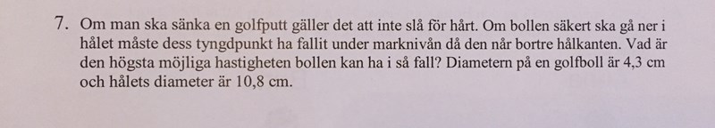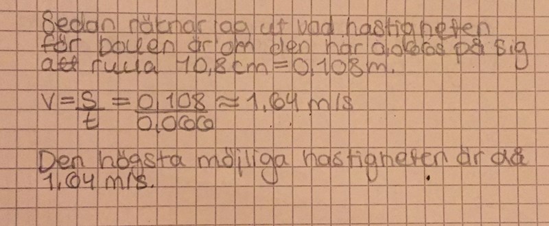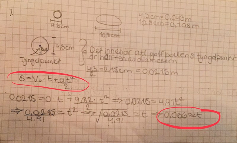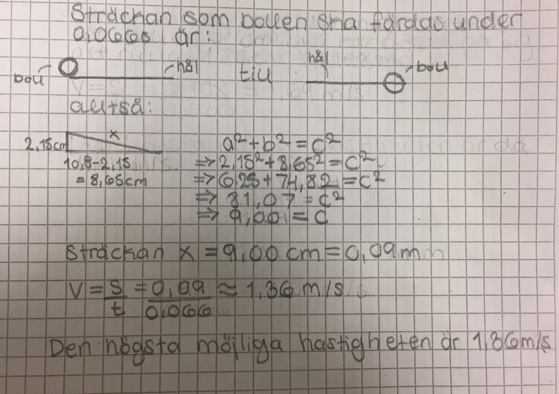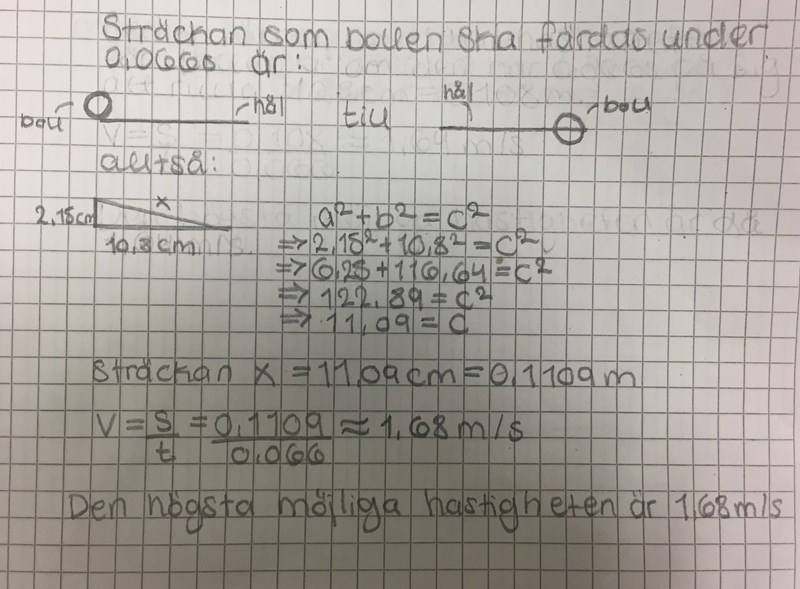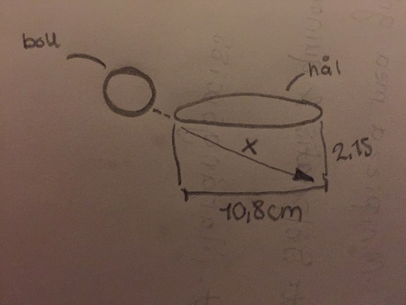 Jag tänker att jag kanske ska räkna med hur snabbt det tar för gravitationskraften att dra ner bollen i hålet, typ. Och sen räkna ut hastigheten för det. Men jag vet inte riktigt hur jag ska bära mig åt.