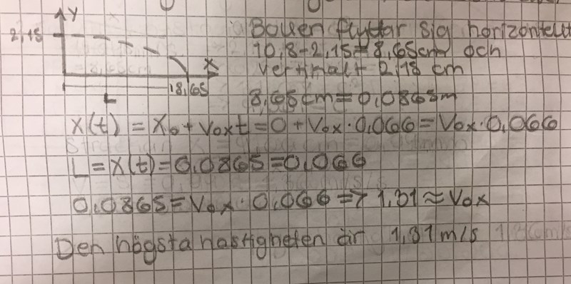Du har räknat ut att golfbollen faller 2,15 cm på 0,066 sekunder. Vilken hastighet i x-led har den, om den hinner rulla 8,65 cm på denna tid?
