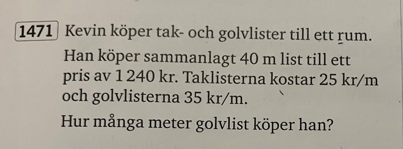 Kalla antalet meter golvlist för X och antalet meter taklist för Y. Kan du nu ställa upp ett ekvationssystem?