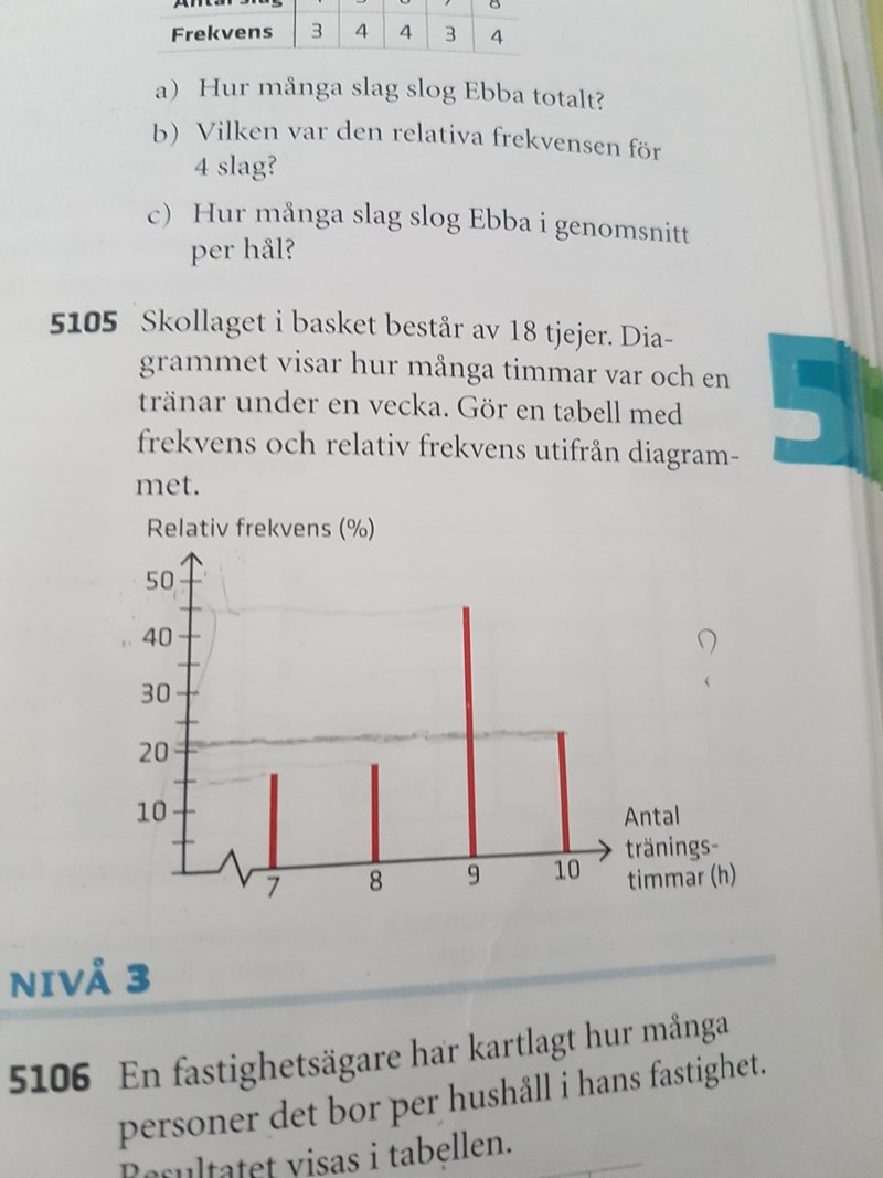5105. Men vet inte hur jag får ut frelvensen. Vet att tex frekvens för 7 träningstimmar/frekvens av alla träningstimmar=0.16. Men ska jag göra ekvationsystem då?