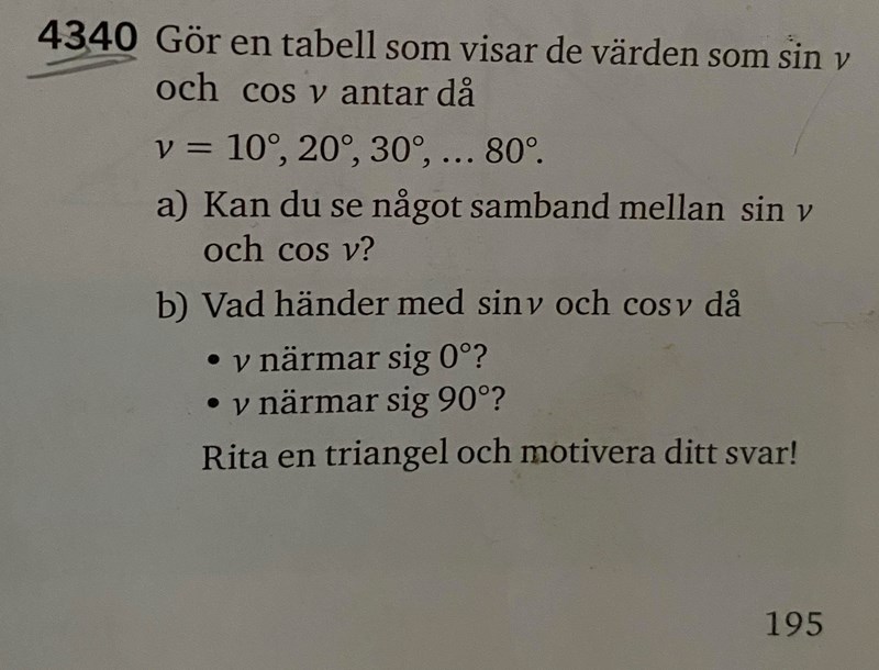 Gör en tabell som visar de värden sin v och cos v antar då v= 10, 20, 30,...80.