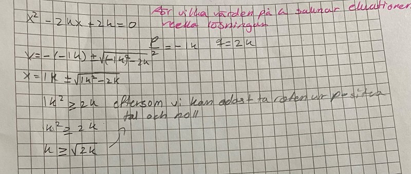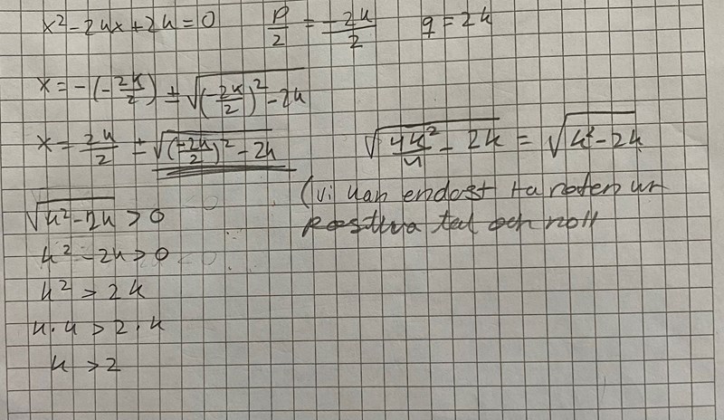 Du behöver inte skriva alla småsteg, men du behöver visa att du vet hur antalet reella rötter hänger ihop med diskriminantens tecken, att du ställer upp ett villkor (olikhet) på diskriminanten för att ekvationen ska sakna reella rötter och att du löser den olikheten på ett effektivt sätt.