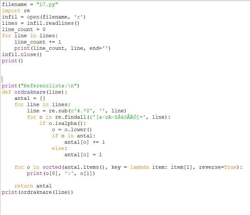 Har denna uppgift: "Gör en variant av programmet som läser en fil (typiskt ett datorprogram). Programmet ska producera en lista med radnummer över filen och en referenslista som för varje ord anger på vilka rader det förekommit. Python-ord som for, if, def... ska inte tas med i listan liksom inga ord från kommentarerna. "
