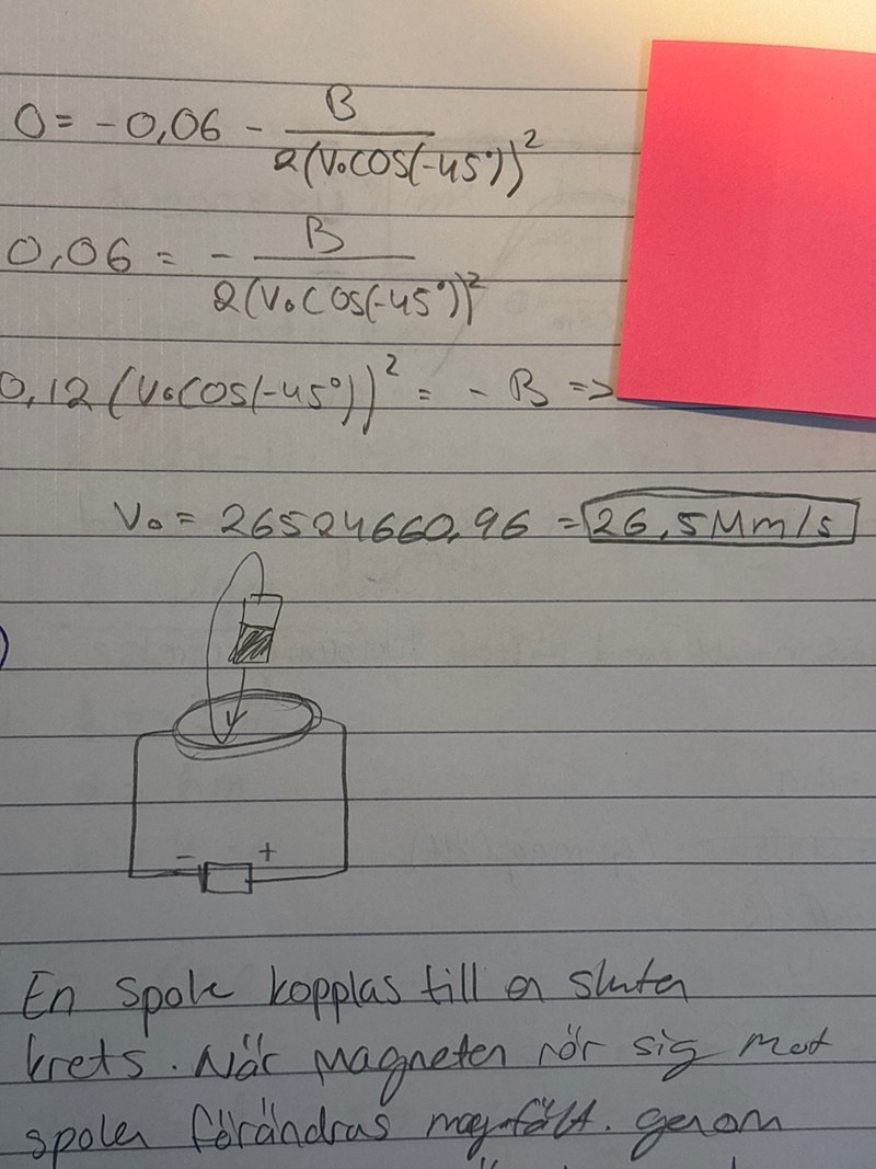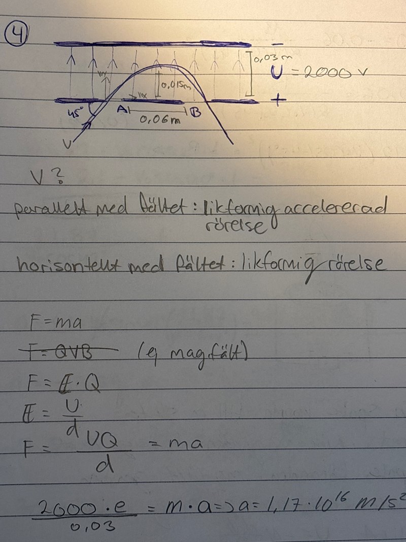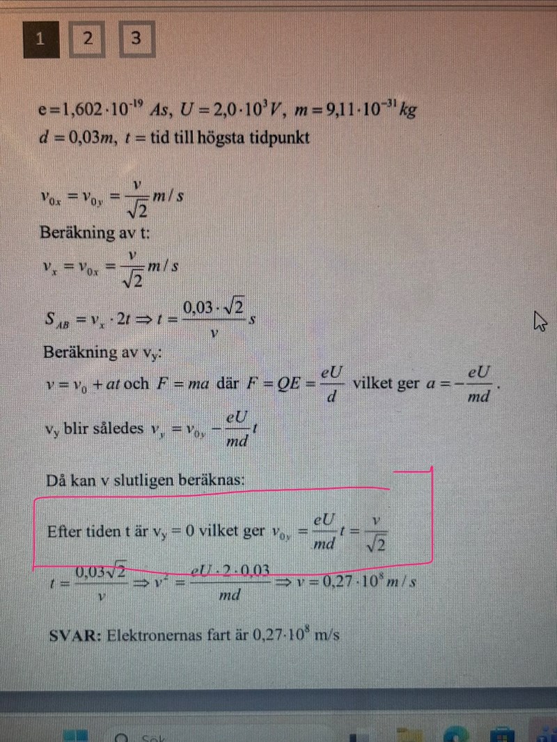 Facit antog istället en okänd tid t när elektronerna befinner sig i den högsta positionen, vilket gav ett villkor att hastigheten i y-led är noll. Denna tid t är halva tiden som elektronerna befinner sig mellan plattorna, vilket facit också utnyttjade. Detta ger en enklare förstagradsekvation.