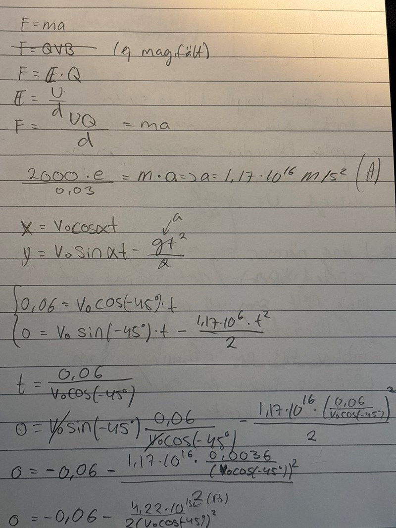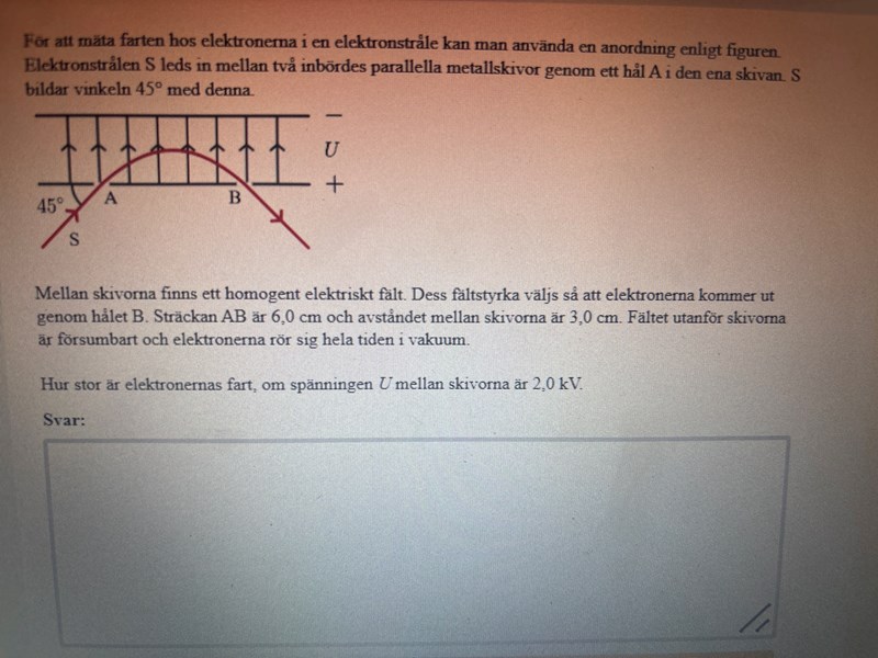 Skillnaden mellan din och facits lösningsmetod var att du antog en okänd tid t när elektronerna lämnade plattan, vilket gav ett villkor att positionen i y-led noll. Detta ger en andragradsekvation.