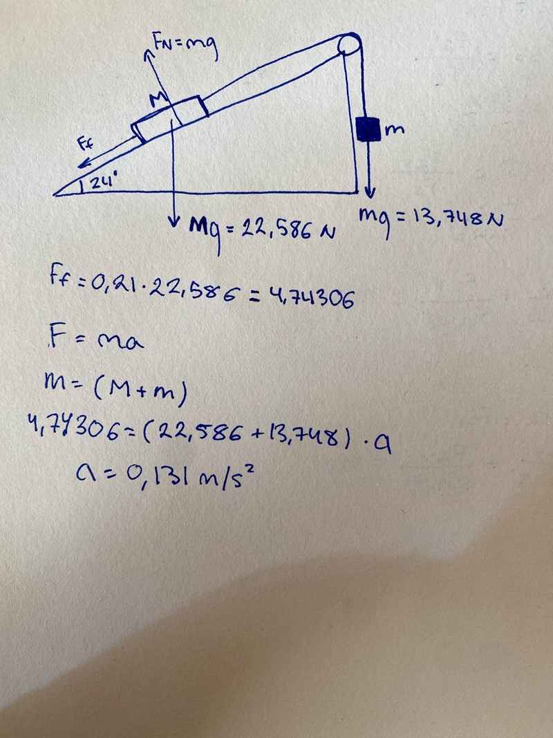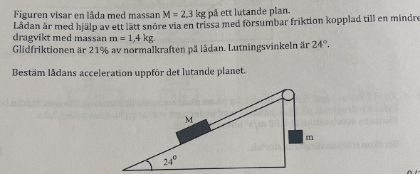 Alltså, klossen dras uppåt av den andra klossens tyngd mgmg men bromsas av sin egna tyngds komposant längs planet samt friktionskraften.