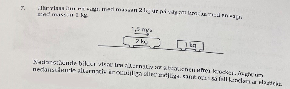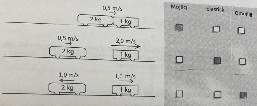 Hej! Jag förstår inte varför mitt svar är fel på första och andra. På första tänkte jag att det är möjligt eftersom vid en fullständigt oelastisk kollision är rörelseenergin större före än efter, precis som på bilden. Ställde jag upp daltandet för en elastisk kollision och fick att det stämde