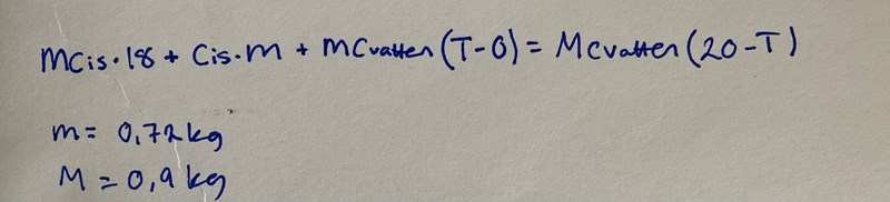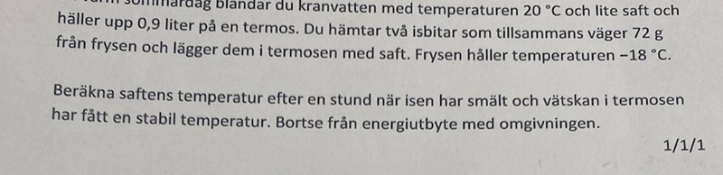 Den där energin tas från saften. Sedan ska vattnet från isen också värmas så det och saften får samma temperatur. Det blir en liten ekvation. Kalla sluttemperaturen i Celsius för x.