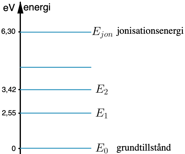 a)Några av de elektroner som passerat gasen hade kinetiska energier på 9,60 eV respektive 7,05 eV. Förklara hur elektronerna kunde ha dessa energier.