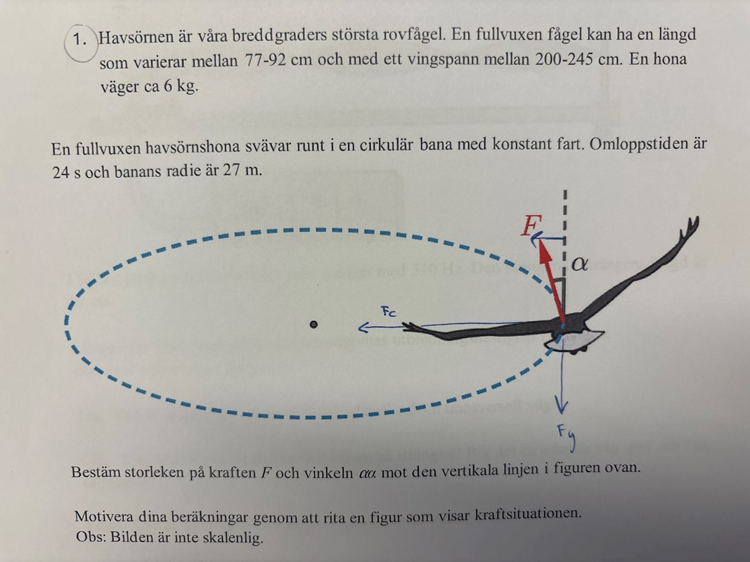 F (den röda pilen) är örnens lyftkraft, snett uppåt-inåt.