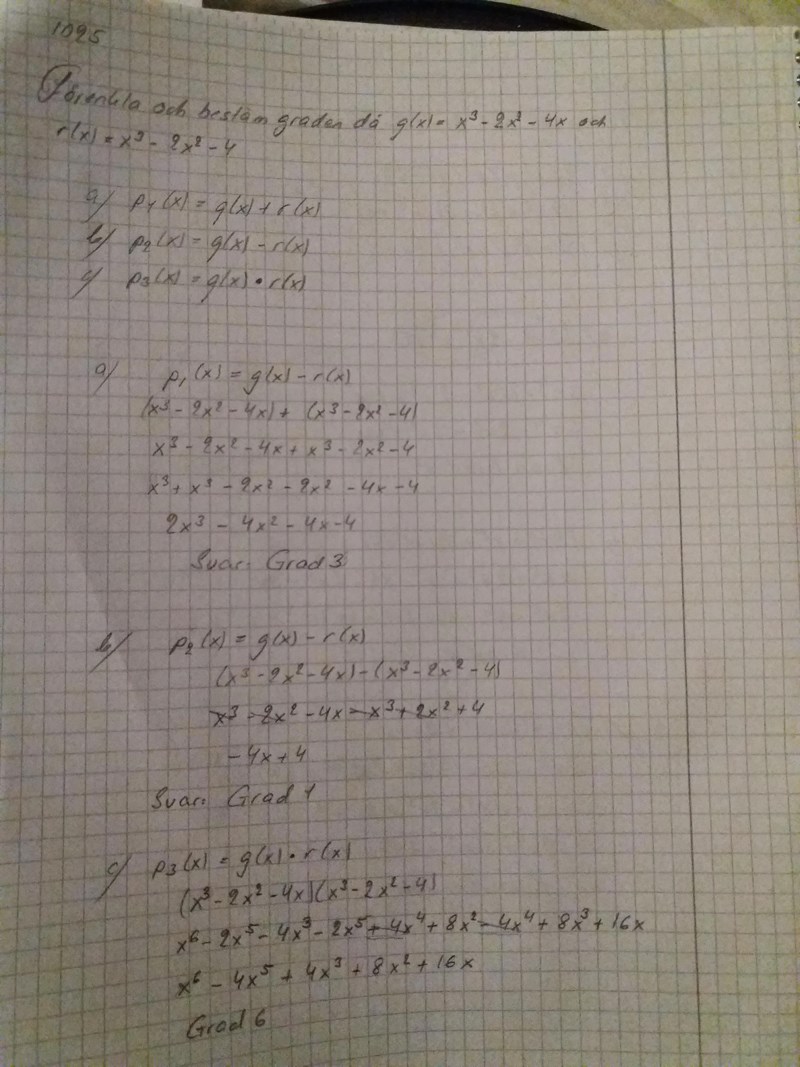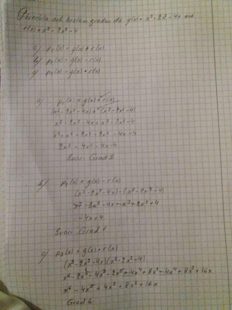 Hmm, jag förstår inte riktigt uppgiften. Ska du göra a), b), c) och sedan skriva vilken grad av polynom det är ?
