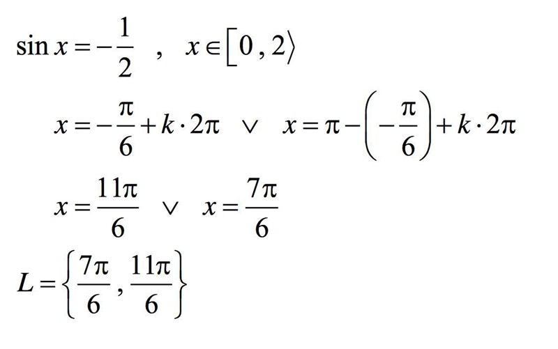 Det är ju inte bara -pi/6 och pi-(-pi/6) som är lösningar, utan ett helt varv + -pi/6 är en lösning, och två hela vara + -pi/6 , och tre hela varv + -pi/6 och... och likadant för den andra lösningen. Vilket heltal k du än stoppar in i uttrycket, så har du en lösning (det är nog vanligare att man använder n och inte k).