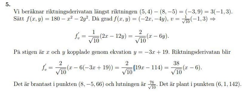 Frågan lyder: z=180-x^2-2y^2 beskriver en kulle. Man följer en stig som är projektion på xy-planet. räta linjen mellan (8,-5) och (5,4) Var är det brantast uppför i stigens riktning och hur stor är lutningen där? De tar fikapausen i den punkt där det är plant i stigens riktning. Var är det?