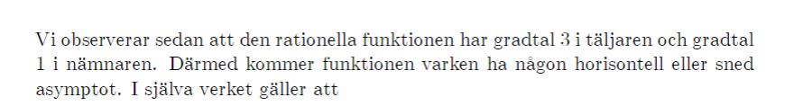 Hej! Jag undrar, hur vet de att funktionen inte har någon horisontell eller sned asymptot då funktionen har gradtal 3 i täljaren och 1 i nämnaren?