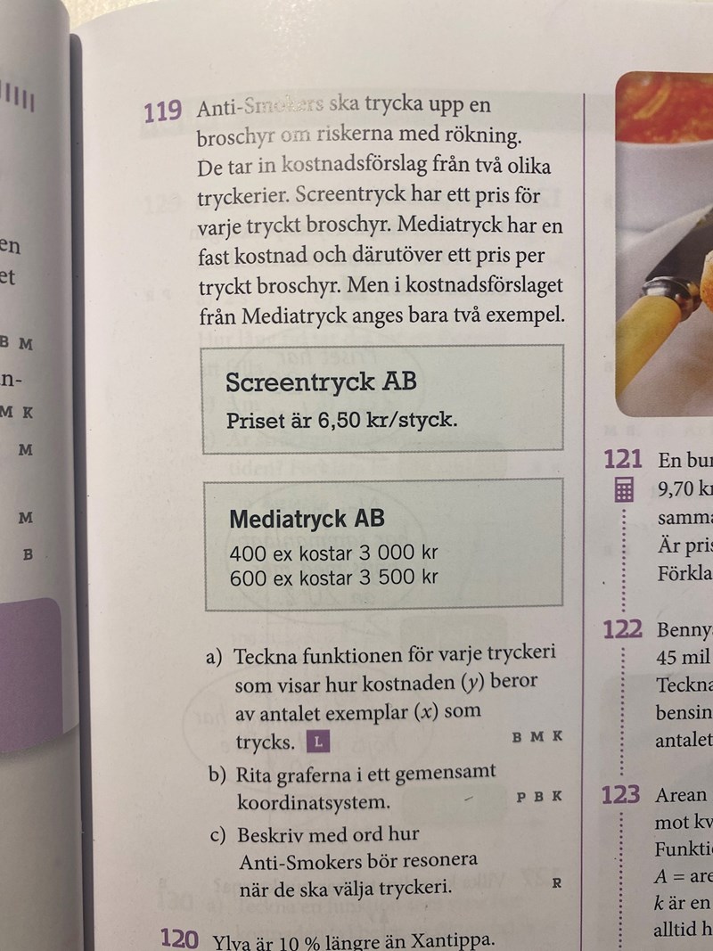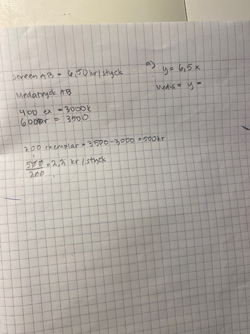 Om man vill ha 400 exemplar, så kostar det 400 gånger den rörliga kostnaden. Hur mycket blir det? DESSUTOM får man betala en fast avgift, så att det totalt kostar 3000 kr. Hur stor är då den fasta avgiften?
