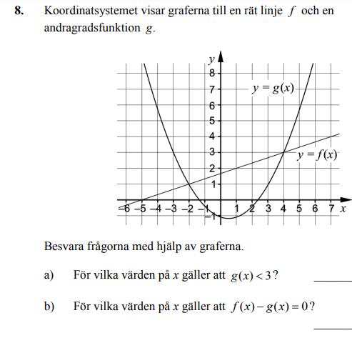 Analys skrev:För x= 4 så blir ju g(x) = 3, nu gällde det för vilka x(alla) som g(x) var mindre än 3.